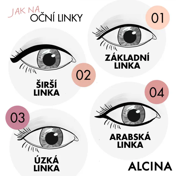 - Arabská linka – veďte pozdĺž hornej línie mihalníc linku, ktorá sa bude smerom k vonkajšiemu okraju oka mierne zosilňovať. Druhú linku vykreslite pozdĺž spodných mihalníc. Obe linky pri vonkajšom okraji spojte a vytiahnite smerom nahor.