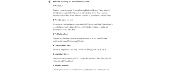 To je odpoveď umelej inteligencie na pokyn, aby navrhla konkrétnu podobu príspevkov pre nový kadernícky salón.